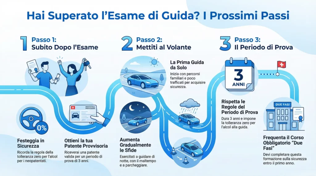 Una volta superato l’esame, è il momento di festeggiare, ma sempre in modo sicuro e responsabile. Assicurati di comprendere le restrizioni che potrebbero applicarsi durante il periodo di prova. In Svizzera, hanno una politica di tolleranza zero per i neopatentati in merito al consumo di alcol, quindi è fondamentale rimanere informati su queste questioni.